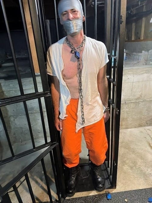 Prisoner @bndgkid.com secured at the bar. Next the prisoner transport to long ten corridors #prisoner #hogtie #bondage linktr.ee/unworthyslut...